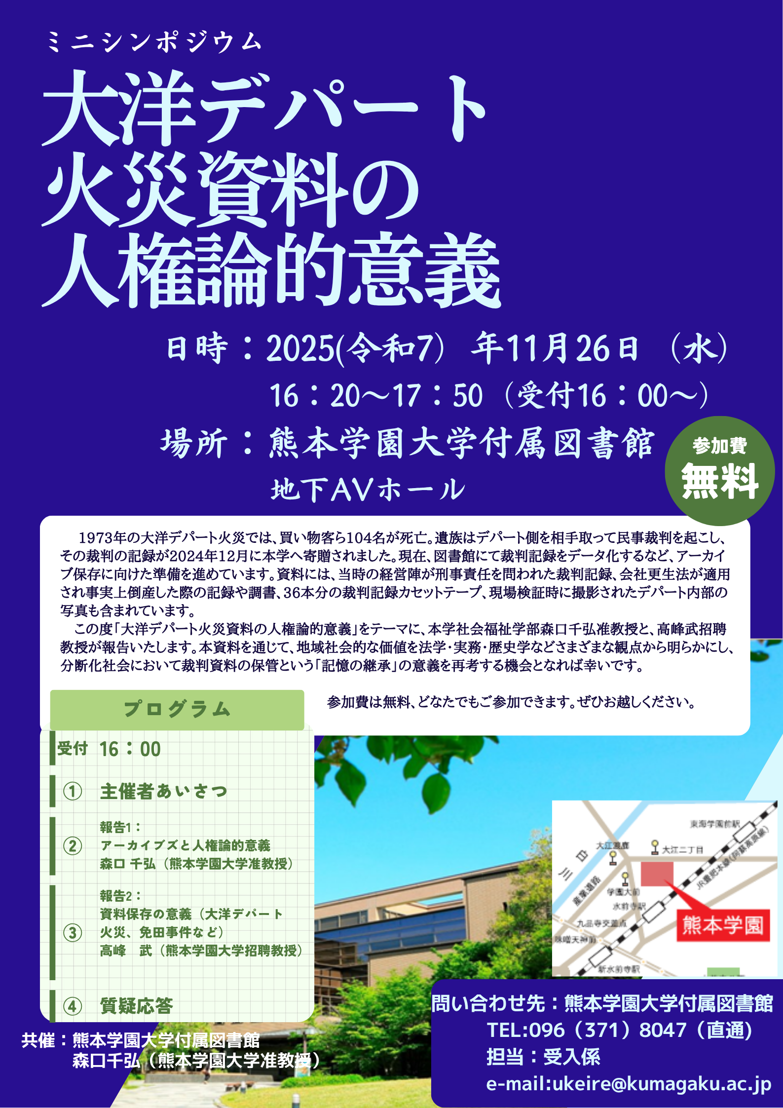図書館にて、11月26日(水)にミニシンポジウム「大洋デパート火災資料の人権論的意義」が開催されます。